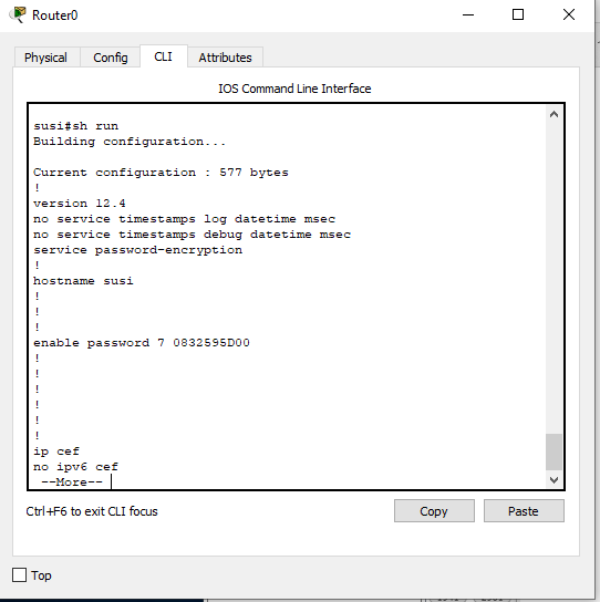Kemudian kita verifikasi dengan perintah “show run”. Kemudian cari baris enable password dan enable secret.