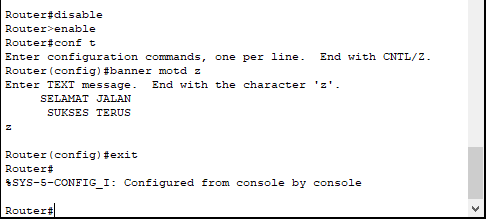 Kemudian kita coba test , dengan cara kluar dari privilege mode “#” ke EXEC Mode “>” , dengan cara ketikkan perintah exit Di Privilege mode. Maka seharusnya akan muncul kalimat banner nya setelah kita tekan Enter.