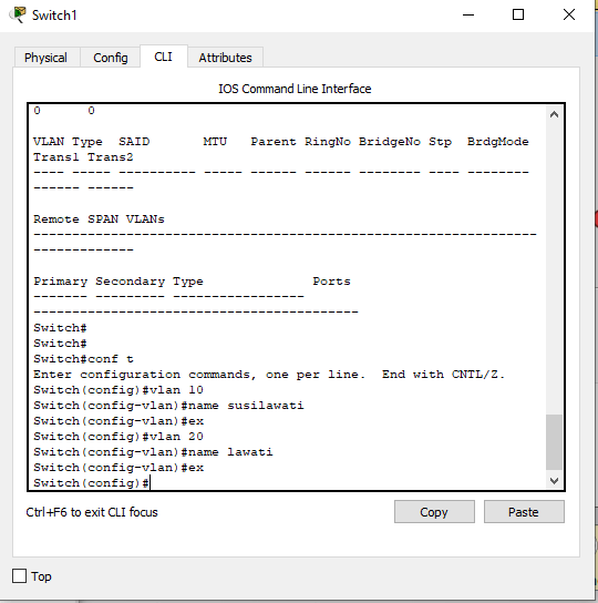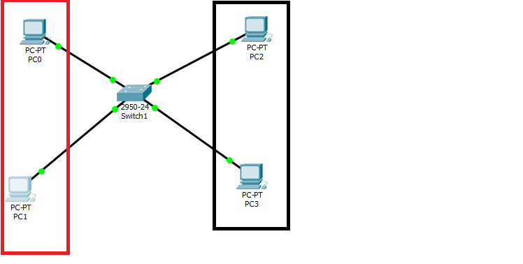 Bisa dilihat , bahwa Switch secara default sudah memiliki VLAN 1 dengan nama default , lalu semua port yang dimiliki switch terdaftar di Vlan 1. Sekarang kita akan membuat Vlan 10 dan 20. Dan mendaftarkan PC sebelah kiri menjadi Vlan 10 dan PC sebelah Kanan menjadi Vlan 20.
