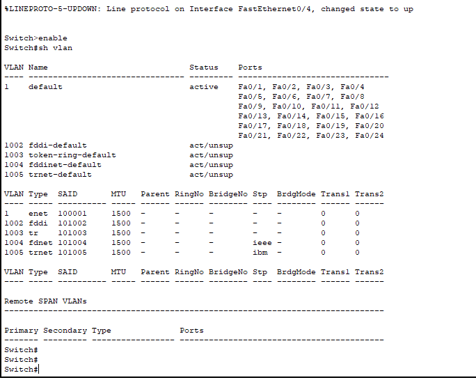 Kemudian kita akan memastikan bahwa semua port itu terdaftar ke Vlan 1, caranya adalah dengan perintah show vlan