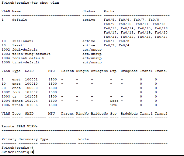 Selanjutnya kita cek vlan nya, apakah interfacenya sudah terdaftar didalam vlan 10 dan vlan 20 tadi. Jika konfigurasi nya benar maka hasilnya akan seperti dibawah ini interface nya sudah terdaftar dimasing – masing vlan.